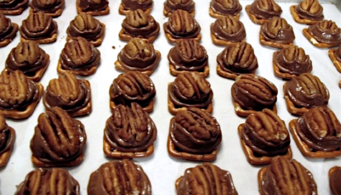 Remove sheet from oven and squash a pecan half on each Rolo. That’s it. Cool in auxiliary refrigerator (a Minnesota garage will do nicely) until chocolate has set again.