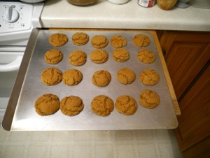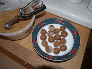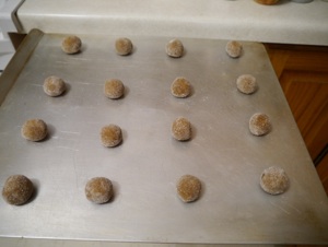 Chill the dough for several hours (mine was in the fridge for about 6 hours) and form into 1-inch balls. Roll them in sugar and put them a couple inches apart on a baking sheet. I don’t grease the sheets and I use my AirBake insulated sheets. I’ve had them for years and years and wouldn’t be without them.