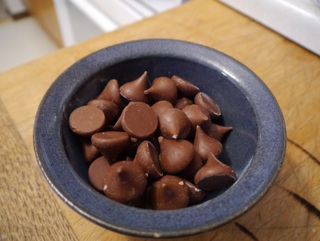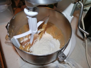 We unwrapped 48 Hershey’s milk chocolate kisses (and then needed about 6 more) and I started mixing the ingredients as described above: fat, peanut butter, sugars, flavor, eggs.