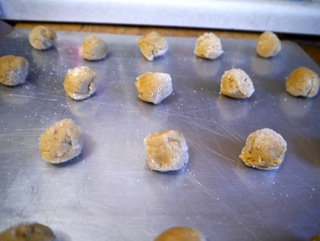 Mix in the combined dry ingredients until the dough has formed, then shape into 1” balls (I used my portioner scoop again) and roll in sugar. Arrange them on a baking sheet with a couple inches between each one and bake at 375 for 10-12 minutes.