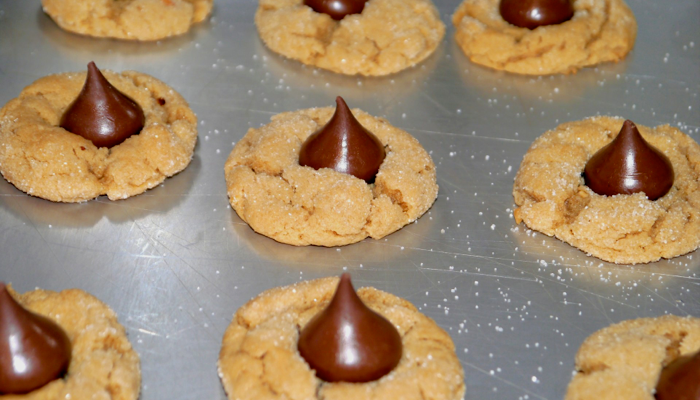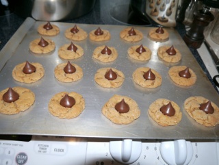 I think that’s what happened to the recipe that was in my files: it had become pretty much a two steps process. The Crisco (gasp!), peanut butter, sugars, egg, and vanilla were all mixed up at once, all together. Then the combined dry ingredients were added. There was another change made to the recipe, too: most recipes now say to bake the cookies for 10-12 minutes, remove them from the oven, and squoosh the kiss on top — fuhgeddabout a partial bake, a kiss squoosh, and sticking them back into the oven. I will use this recipe for the next batch I we make.