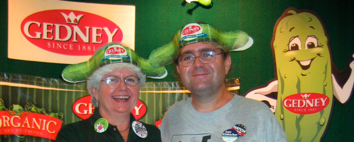 These entries are about the Great Minnesota Get-Together; Chris was with me on Opening Day of the 2006 Minnesota State Fair; he stopped by while I was doing my shift at the Gedney booth in the Creative Activities Annex Building. Want a Pickle Hat, Little Boy?